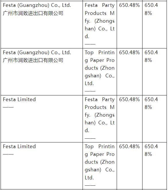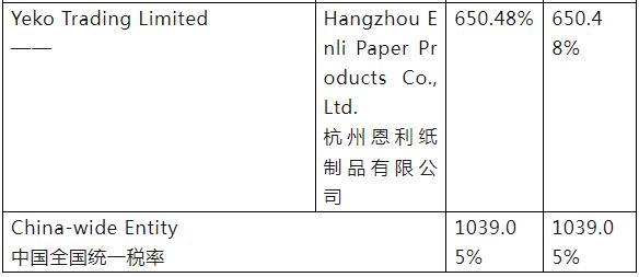 2024年8月30日,美國商務部宣布對進口自中國、泰國和越南的紙盤(Certain Paper Plates)作出反傾銷初裁,初步裁定中國生產商/出口商的傾銷率為0.00%~1039.05%(抵消補貼后的保證金調整為不適用~1039.05%,具體稅率詳見下表)、泰國生產商/出口商的傾銷率為4.23%~73.17%、越南生產商/出口商的傾銷率為0.00%~165.27%(抵消補貼后的保證金調整為0.00%~159.79%)。美國商務部預計將于2025年1月13日對本案作出反傾銷終裁。本案涉及美國海關編碼4823.69.0040項下產品。