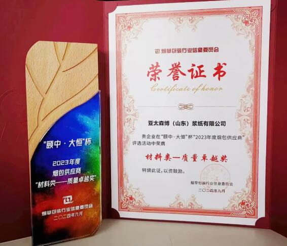 9月11日,2024年煙草包裝最新發展趨勢研討會暨2023年度煙草包裝系列評選活動頒獎慶典在青島舉行。亞太森博榮獲2023年度煙包供應商“材料類——質量卓越獎”。