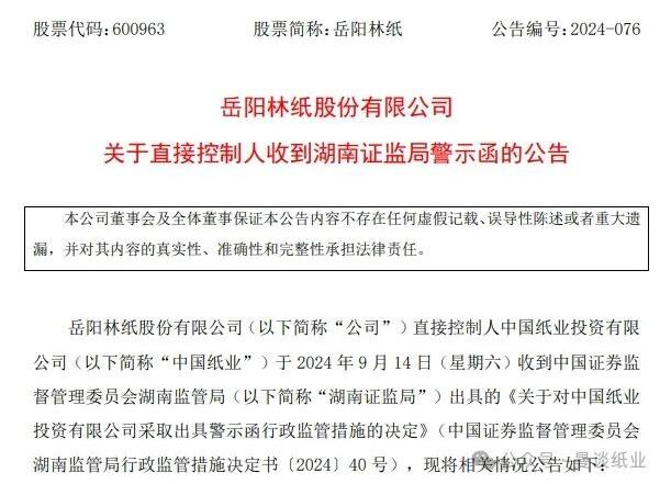 岳陽林紙9月18日公告,公司直接控制人中國紙業投資有限公司(以下簡稱“中國紙業”)于9月14日收到湖南證監局出具的《關于對中國紙業投資有限公司采取出具警示函行政監管措施的決定》。 中國紙業作為公司的直接控股股東,在公司非公開發行股票購買誠通凱勝生態建設有限公司(以下簡稱“誠通凱勝”)資產期間,要求誠通凱勝原股東出具后續增資誠通凱勝的承諾函,之后又協商將增資對象調整為其他公司,中國紙業未將上述事項告知公司予以披露。 上述行為違反了規定。根據規定,湖南證監局決定對中國紙業采取出具警示函的行政監管措施,并記入證券期貨市場誠信檔案。