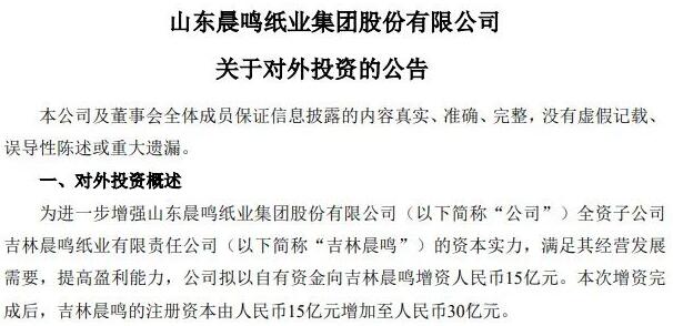 晨鳴紙業(yè)(000488)9月19日晚間公告,為進一步增強公司全資子公司吉林晨鳴紙業(yè)有限責任公司(簡稱“吉林晨鳴”)的資本實力,滿足其經(jīng)營發(fā)展需要,公司擬以自有資金向吉林晨鳴增資15億元。增資完成后,吉林晨鳴的注冊資本由15億元增至30億元。