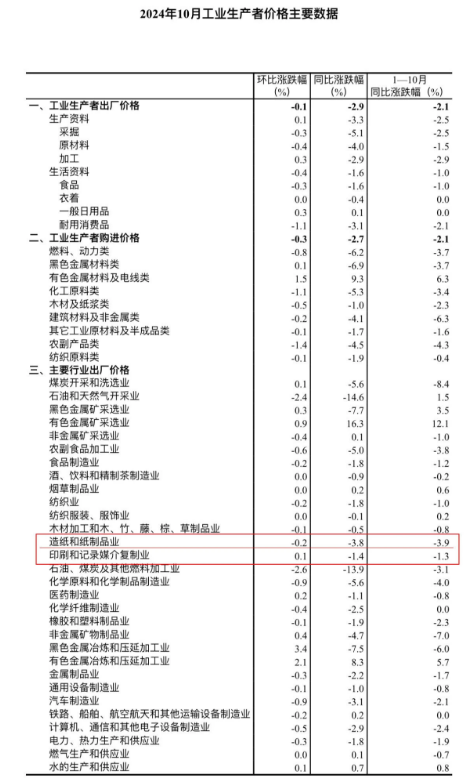 值得關注的是,2024年10月份造紙和紙制品業工業生產者出廠價格同比下降3.8%,1—10月造紙和紙制品業工業生產者出廠價格同比下降3.9%;2024年10月份印刷和記錄媒介復制業工業生產者出廠價格同比下降1.4%,1—10月印刷和記錄媒介復制業工業生產者出廠價格同比下降1.3%。