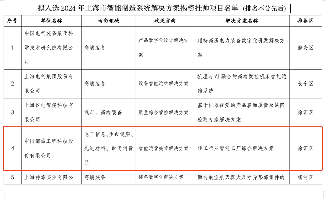 近日,中國海誠“輕工行業智能工廠解決方案”入選上海市經濟與信息化委員會公布的2024年度上海市智能制造系統解決方案“揭榜掛帥”項目。