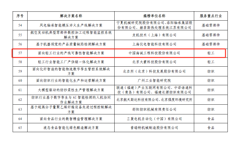 近日,中國海誠“面向輕工行業的產線可靠性智能解決方案”入選工業和信息化部辦公廳、市場監管總局辦公廳聯合發布的2024年度智能制造系統解決方案“揭榜掛帥”項目。