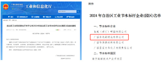 “守合同 重信用”企業公示活動是政府對企業信用的一種綜合評價和正向激勵,獲得該公示的企業集中體現了企業和品牌具有一定社會影響力、合同信用管理體系健全、合同行為規范、合同履約狀況好、經營效益達到較高水平、社會信譽好等一系列特點。 2024年自治區工業節水標桿企業 2024年12月31日,自治區工業和信息化廳公布2024年自治區工業節水標桿企業(園區)名單,廣西金桂漿紙業有限公司獲評2024年度自治區工業節水標桿企業。