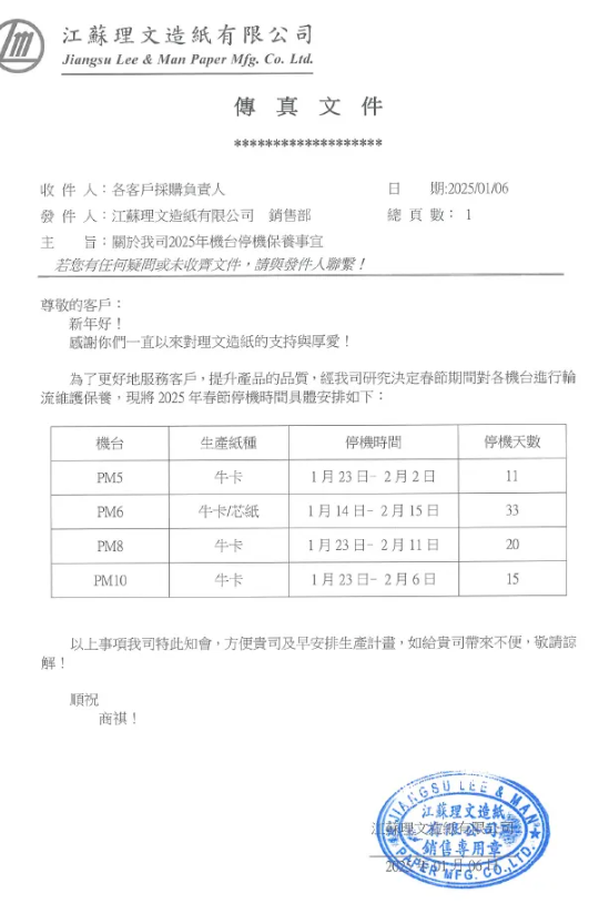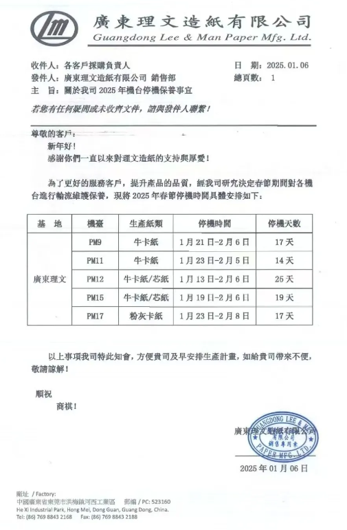 1月6日,理文造紙發布2025年春節停機計劃,國內四大基地的14臺包裝紙機將在1月中旬至2月中旬期間開展檢修,預計減產26.8萬噸包裝紙,其中包括3萬噸灰底白板紙和23.8萬噸箱板瓦楞紙。 在東莞洪梅工廠,5臺紙機計劃在1月13日至2月8日期間輪停14-25天,預計削減市場供應約11.7萬噸。該工廠還有一臺箱板紙機PM 7.未出現在停機計劃中。