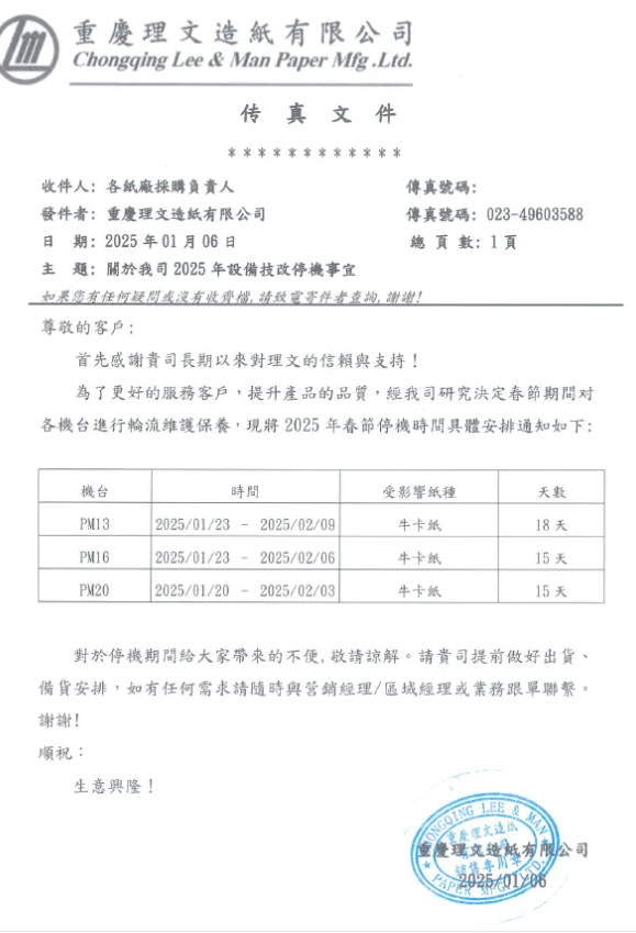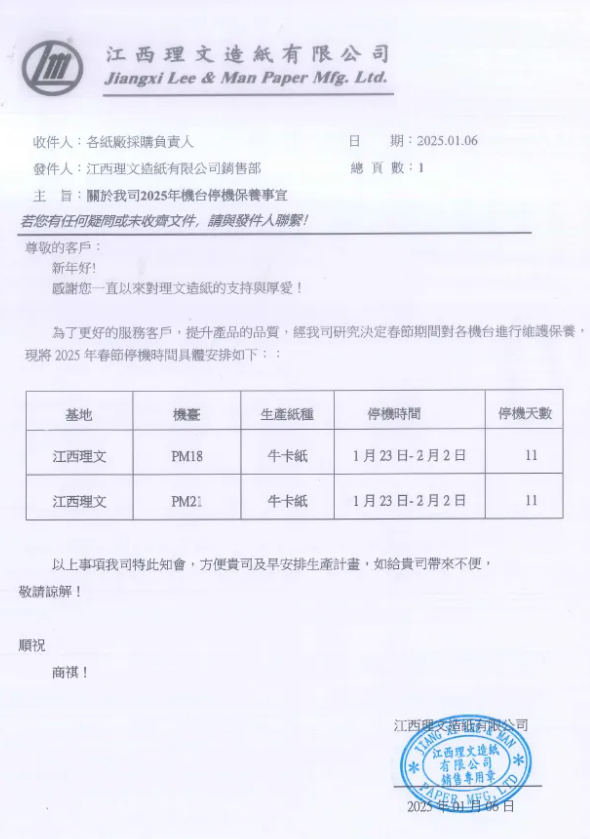 重慶理文的三臺箱板紙機將在1月20日至2月9日期間減產近4.8萬噸。 江西理文的兩臺紙機計劃在1月23日至2月2日停機11天。