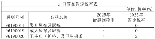 其中,嬰兒尿布及尿褲(96190011)和成人尿布及尿褲(96190019)2025年的進口暫定稅率為0%。衛(wèi)生巾(護墊)及衛(wèi)生棉條(96190020)2025年的進口暫定稅率為2%。