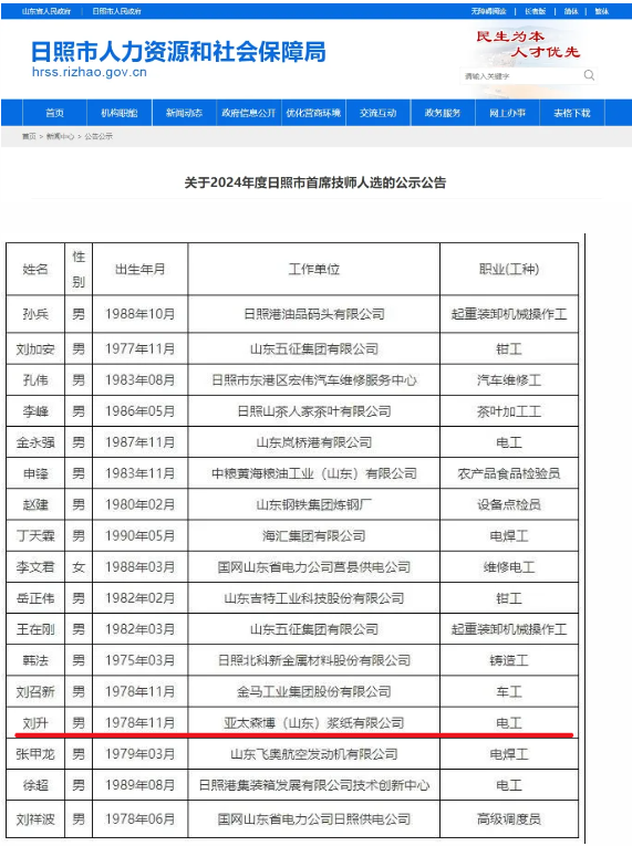 2024年度日照市首席技師 近日,市委組織部、市人社局、市財政局聯合公布了2024年度日照市首席技師名單,亞太森博紙板電氣部劉升順利入選,同時他也成為公司繼郭同安、夏兆江、宋琛年、單來亭、呂愛民之后的第6位日照市首席技師。 公示公告