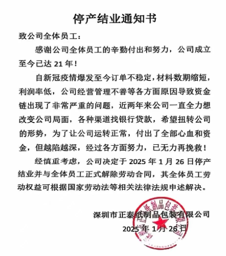近日,一則令人唏噓的消息在包裝印刷行業(yè)引起廣泛關(guān)注——專注于紙品包裝業(yè)務(wù)的深圳市正泰紙制品包裝有限公司,在2025年春節(jié)前夕宣布停產(chǎn)結(jié)業(yè)。