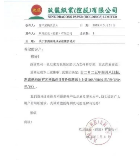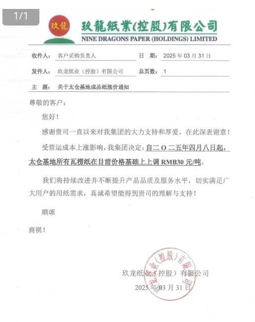 近期國內包裝紙市場出現新一輪價格上漲動向。繼東莞區域部分中小型紙企于上周末試探性調價30元/噸后,主要紙業大廠陸續釋放提價信號。江西理文造紙基地率先發布通知,計劃于4月7日上調Q紙與K紙報價30元/噸。幾乎同期,玖龍紙業東莞、太倉兩大生產基地宣布自4月8日起,瓦楞紙系列產品全線上調同等幅度。