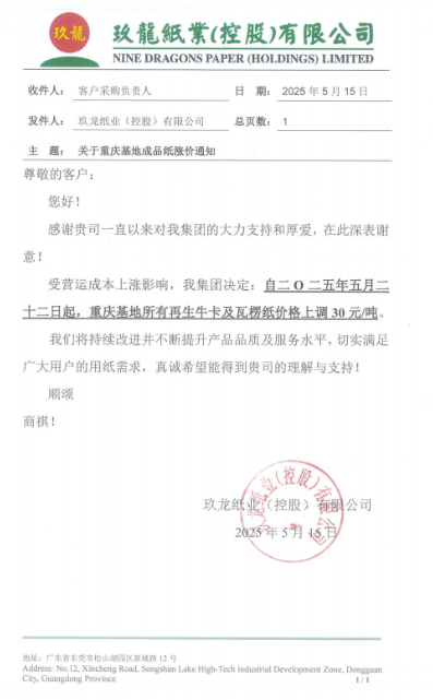 • 玖龍重慶基地:自5月22日起,所有再生牛卡及瓦楞紙價(jià)格上調(diào)30元/噸。