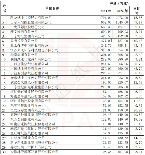 △2024年紙及紙板產(chǎn)量100萬噸以上的省(區(qū)、市) 在《中國造紙工業(yè)2024年度報(bào)告》中,國內(nèi)重點(diǎn)造紙產(chǎn)量前30強(qiáng)企業(yè)出爐。其中,玖龍紙業(yè)以超過2000萬噸的產(chǎn)量遙遙領(lǐng)先,太陽紙業(yè)的年產(chǎn)量也突破了1000萬噸,山鷹國際、理文造紙的年產(chǎn)量超過700萬噸,其余26家紙企年產(chǎn)量在100萬噸-460萬噸之間。 值得一提的是,金光集團(tuán)APP旗下山東博匯集團(tuán)、廣西金桂漿紙業(yè)、寧波亞洲漿紙業(yè)、江蘇金東紙業(yè)、海南金海漿紙業(yè)、金紅葉紙業(yè)6家企業(yè)入圍,總產(chǎn)量逼近1500萬噸。若以此數(shù)據(jù)計(jì)算,金光集團(tuán)APP在中國的產(chǎn)能僅次于玖龍紙業(yè)。