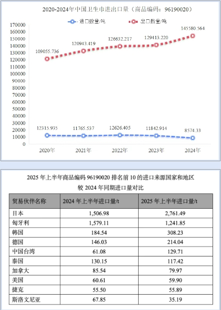 進(jìn)口 2025年上半年,吸收性衛(wèi)生用品的進(jìn)口仍然較少,總進(jìn)口量為1.21萬(wàn)t,對(duì)國(guó)內(nèi)消費(fèi)市場(chǎng)影響很小。 衛(wèi)生巾進(jìn)口量近年來(lái)保持穩(wěn)定,全年進(jìn)口總量保持在1.2萬(wàn)t左右,2024年衛(wèi)生巾進(jìn)口量較2023年減少3.268.58t,衛(wèi)生巾產(chǎn)品已能滿足國(guó)內(nèi)市場(chǎng)消費(fèi)者的需求。2025年上半年衛(wèi)生巾進(jìn)口量較2024年同期增加1.092.35t,分析增長(zhǎng)的原因是受2024年11月“衛(wèi)生巾輿情事件”影響,從日本進(jìn)口量有所增長(zhǎng),2025年上半年衛(wèi)生巾從日本的進(jìn)口量增長(zhǎng)1.254.51t。