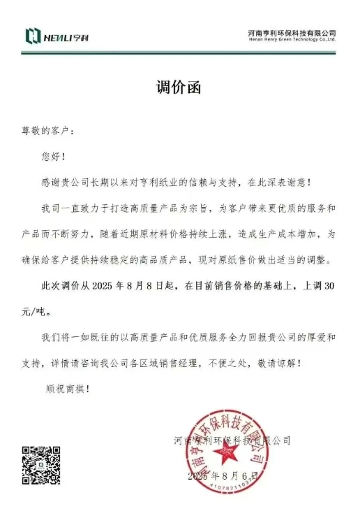 從2025年8月8日起,在目前銷售價格的基礎上,上調 30 元/噸。