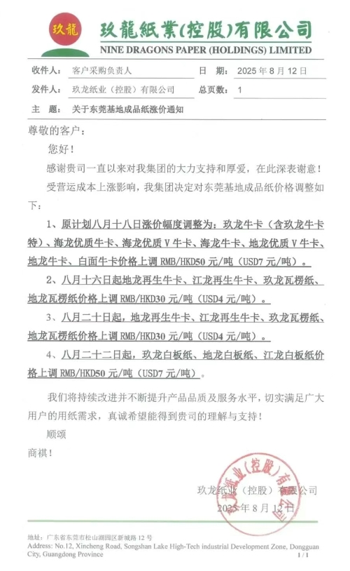 再看山鷹紙業,8月12日宣布華中基地于8月15日上漲,福建基地、廣東基地的多個紙種將在8月16日上漲;8月14日,山鷹紙業再度發函,宣布浙江基地、安徽基地多個紙種將上漲30-50元/噸。 原紙漲價“沒完沒了”,下游紙板行業成本急劇上升,有企業稱“受原材料持續上漲影響,公司資金壓力不斷增加”。為緩解價格壓力,廣東、浙江、河南等多地紙板廠紛紛發布漲價函,同時對訂單交期作出限制。 毫無疑問,在這個8月份,原紙、紙板漲價函正在來襲! 部分紙板漲價函 商丘市聯諾包裝有限公司 自8月15日起,二層每平方上調0.02元,三層每平方上調0.03元,四層、五層每平方上調0.05元。 鶴山市勝源紙品有限公司 自8月14日20點起,三層紙板價格上調5分,四層及五層紙板價格上調8分。 浙江國立包裝限公司 自8月13日起,三層紙板上調0.05元/平方米,四層紙板上調0.10元/平方米,五層紙板上調0.10元/平方米。 蘭溪市錢村福利包裝廠 自8月12日起,五層上調0.05元/單平方,三層上調0.03元/單平方。 浙江浪莎包裝 自8月12日12點起,三層上調0.03元/平方,四、五層上調0.05元/平方。 浦江豐愷包裝有限公司 自8月12日下午17:00起,三層上調0.03元/單平方,五層上調0.05元/單平方,七層上調0.08元/單平方。 浙江松格紙制品有限公司 自8月12日起,三層紙板上調0.03元/單平方,五層紙板上調0.05元/單平方,七層紙板上調0.10元/單平方。