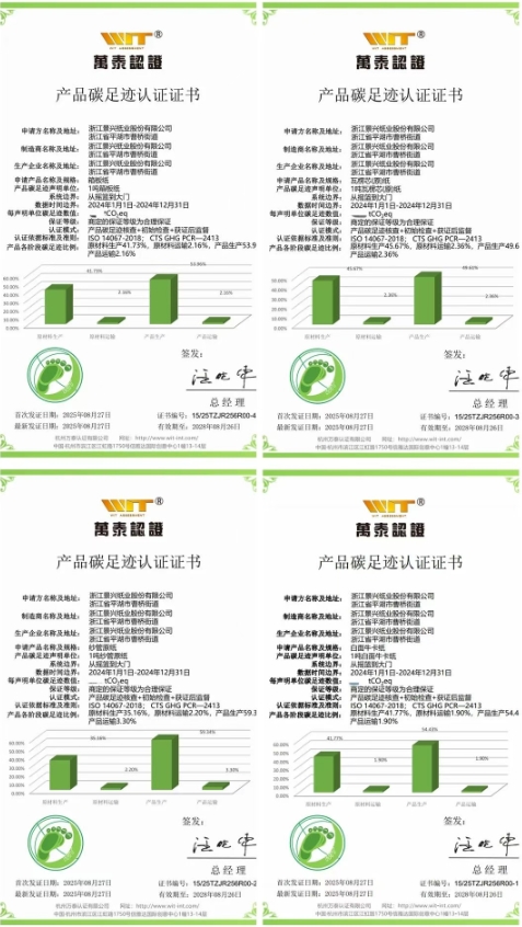 8月27日,景興紙業生產的箱板紙、瓦楞芯(原)紙、紗管原紙及白面牛卡紙四項產品順利通過第三方權威認證機構的嚴格審核,成功獲得產品生命周期碳足跡認證證書。這一認證不僅彰顯了企業在綠色低碳轉型征程中的堅定決心與務實行動,更為深化綠色制造戰略筑牢了根基。
