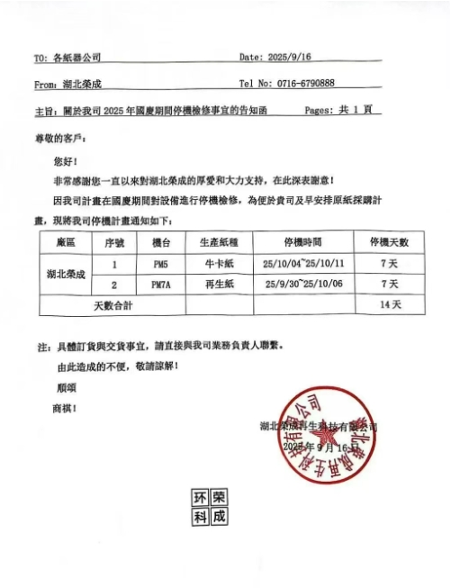 造紙廠最新調價通知 • 玖龍紙業太倉基地 1、自九月二十二日起,太倉基地海龍優質牛卡價格上調50元/噸,地龍優質牛卡價格上調30元/噸。 2、自九月二十六日起,太倉基地瓦楞紙價格上調30元/噸。 • 玖龍紙業泉州基地 自九月二十二日起,泉州基地所有牛卡、瓦楞紙價格上調RMB30元/噸。 • 玖龍紙業重慶基地 自九月二十二日起,重慶基地再生牛卡價格上調50元/噸。 • 山鷹紙業 自9月17日起,在原有價格基礎上: 廣東基地:紅杉、T紙上調50元/噸,瓦紙上調30 元/噸; 自9月20日起,在原有價格基礎上: 浙江、安徽基地:紅杉、T紙、瓦紙上調30元/噸; 自9月22日起,在原有價格基礎上: 福建基地:紅杉系、瓦紙系上調30元/噸; 浙江、安徽基地:紫杉、金杉上調30元/噸。 • 榮成環保 于9月26日起,針對我司T紙/瓦紙上調30元/噸。 造紙廠停機計劃 • 玖龍紙業湖北基地