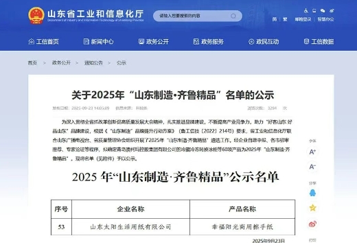 近日,山東省工業(yè)和信息化廳公示了2025年“山東制造·齊魯精品”名單,其中,公司幸福陽(yáng)光商用擦手紙憑借突出的產(chǎn)品質(zhì)量和品牌優(yōu)勢(shì)成功入選。