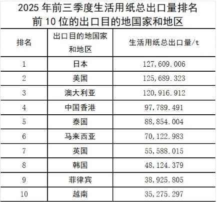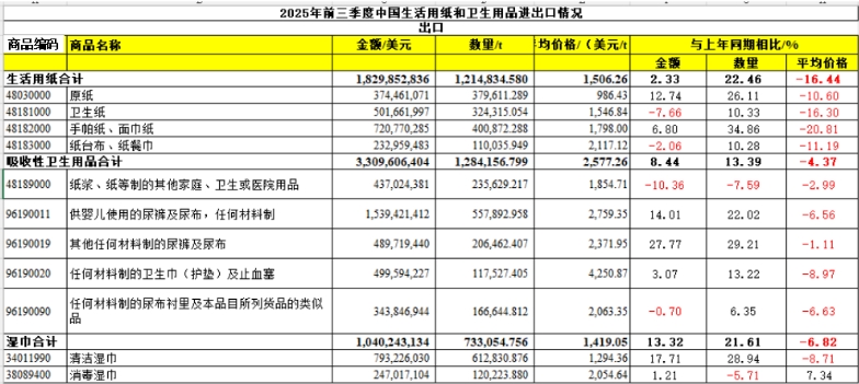 根據海關統計數據,2025年前三季度,中國生活用紙和衛生用品繼續呈現貿易順差走勢,并且出口量顯著增長,但產品出口價格普遍下降。各類產品具體進出口情況分析如下: 生活用紙 2025年前三季度,中國生活用紙的出口量顯著增長,進口量雖也有增長,但總量相對較少。中國生活用紙市場以出口為主,國內生活用紙產量和產品種類已經能夠滿足本地市場需求,進口對國內市場影響很小。 出口 2025年前三季度,生活用紙的出口量同比增長22.46%,達到121.48萬t,出口金額為18.30億美元,同比增長2.33%。生活用紙的出口平均價格同比下降16.44%,出口呈現量增價減的趨勢。出口的生活用紙仍以成品紙(商品編碼48181000衛生紙;48182000手帕紙、面巾紙;48183000紙臺布、紙餐巾)為主,成品紙出口量占生活用紙產品總出口量的68.75%。成品紙中商品編碼48182000(手帕紙、面巾紙)出口量增長最快,為34.86%。