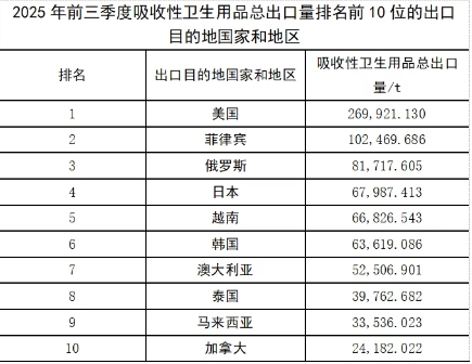 進口 2025年前三季度,生活用紙總進口量比2024年同期增長,但進口量很少,僅有約3.57萬t。進口的生活用紙以原紙為主,占總進口量的91.2%。 吸收性衛生用品 2025年前三季度,中國吸收性衛生用品出口量持續增長,進口量則不斷下滑,這主要是由于國內吸收性衛生用品產能增長、品質提升,對進口產品的需求下降。 出口 2025年前三季度,吸收性衛生用品的總出口量達128.42萬t,同比增長13.39%,嬰兒紙尿褲在吸收性衛生用品出口量中占比最大,占總出口量的43.44%。吸收性衛生用品的出口金額達33.10億美元,同比增長8.44%。 女性衛生用品、嬰兒紙尿褲、成人失禁用品的出口量均有不同程度的增長,但寵物墊、護理墊等衛生用品出口對應的商品編碼48189000(紙漿、紙等制的其他家庭、衛生或醫院用品)下的產品出口量同比下降7.59%。分析原因是美國加征關稅對我國二、三季度出口帶來一定的影響,該編碼下產品出口目的地排名第一的美國的出口量由2024年前三季度的93.095.289t,下降到2025年前三季度的73.015.091t。