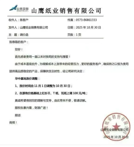 11月3日,山鷹紙業(yè)發(fā)布了最新調(diào)價(jià)函。