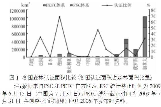 目前,世界森林認證面積主要是由FSC和PEFC兩大認證體系認證的,占認證總面積的93%。到2009年6月15日,由FSC認證體系認證的森林面積(FM認證)達到1144087.42km2;到2009年7月31日,由PEFC認證體系認證的森林面積(FM認證)達到2265927.09km2;兩大體系認證的森林面積達到3410014.51km2,其中FSC認證面積占33.55%,PEFC認證面積占66.45%;但FSC認證的國家涉及五大洲的82個,而PEFC主要集中在歐美等國的20個。 世界上主要國家的森林認證面積及比例見圖1。