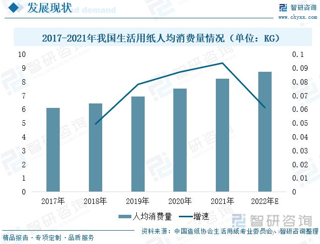 生活用紙是消費量巨大的日用消費品,隨著我國經(jīng)濟發(fā)展水平和人民生活水平日益提高,全國各地區(qū)對生活用紙的消費量都呈穩(wěn)定增長態(tài)勢。數(shù)據(jù)顯示:2021年我國生活用紙消費量達到1162萬噸,同比增長10.77%,國內(nèi)生活用紙市場規(guī)模約1406.6億元,是全球最大的生活用紙消費國。隨著居民生活水平不斷提升以及消費者健康衛(wèi)生意識不斷增強,2022年生活用紙消費量將延續(xù)增長態(tài)勢,達到1236萬噸,這將進一步拉動造紙設(shè)備需求上漲。同時,隨著人們對生活用紙質(zhì)量要求越來越高,使得造紙行業(yè)對造紙設(shè)備技術(shù)要求逐步提升,也將進一步推動造紙設(shè)備升級轉(zhuǎn)型,行業(yè)發(fā)展?jié)摿^大。