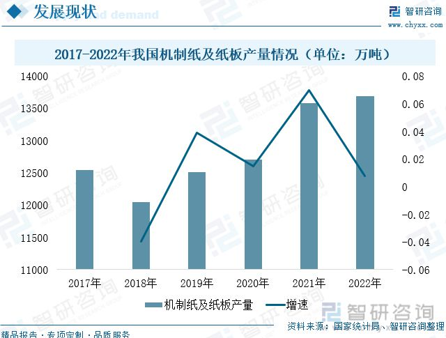 機制紙及紙板廣泛用于多個領(lǐng)域,國家統(tǒng)計局?jǐn)?shù)據(jù)顯示,2018-2022年,我國機制紙及紙板產(chǎn)量穩(wěn)步上漲。2022年全國生產(chǎn)機制紙及紙板13691.4萬噸,同比增長0.79%,行業(yè)延續(xù)增長態(tài)勢,國內(nèi)巨大的紙張需求為造紙設(shè)備提供了廣闊的發(fā)展空間。
