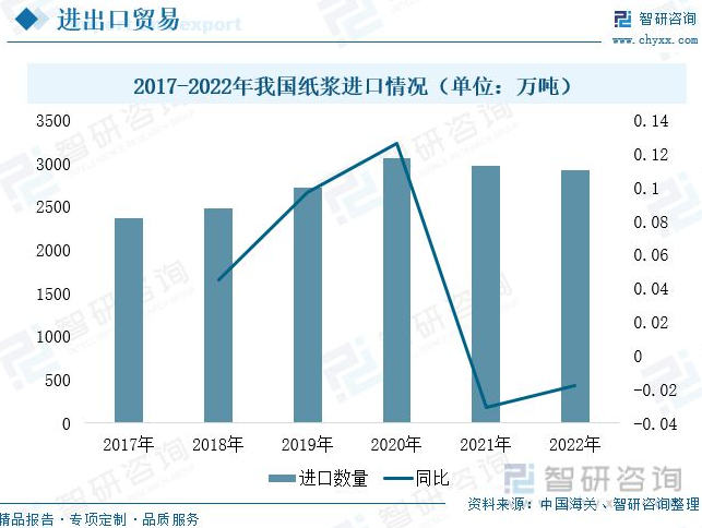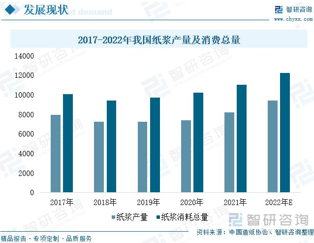 三、下游市場穩(wěn)健發(fā)展,行業(yè)需求潛力巨大 下游市場對造紙設(shè)備行業(yè)發(fā)展具有重要促進作用,下游產(chǎn)業(yè)不斷擴張有利于本行業(yè)市場開拓與產(chǎn)品研發(fā)。其中,紙漿是造紙工業(yè)中最重要的原材料,紙漿生產(chǎn)設(shè)備品類較多,主要包括磨漿機、分切復(fù)卷機、干燥漿板機、壓縮機等多個造紙設(shè)備。2017-2022年,我國紙漿產(chǎn)量及消費量不斷增加。2021年我國紙漿產(chǎn)量及消費總量分別增長10.83%和7.94%。2022年隨著下游用紙需求不斷增加,紙漿產(chǎn)量及消費量延續(xù)增速,同比增速約為15%和10.85%。未來,隨著國內(nèi)制漿生產(chǎn)線規(guī)模不斷擴大及對制漿質(zhì)量要求不斷提高,紙漿制造設(shè)備需求將進一步上漲。