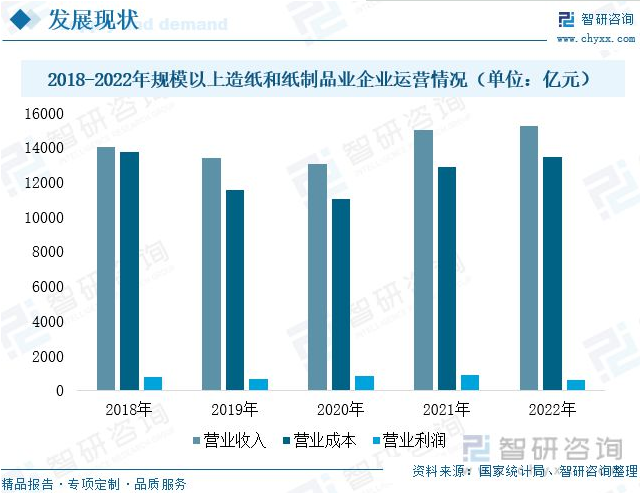 行業(yè)營業(yè)收入穩(wěn)步增長。造紙行業(yè)與國民生活息息相關(guān),2018-2022年,我國造紙行業(yè)市場規(guī)模穩(wěn)步增長。2020年受新冠疫情影響,造紙行業(yè)景氣度整體處于較低水平,行業(yè)收入下降2.67%。2021年國內(nèi)經(jīng)濟恢復(fù)向好,我國規(guī)模以上造紙和紙制品業(yè)營業(yè)收入增長15.32%,營業(yè)利潤增長7.03%。2022年國內(nèi)經(jīng)濟受疫情沖擊較大,行業(yè)未來供應(yīng)鏈?zhǔn)茏瑁?guī)模以上造紙和紙制品業(yè)營業(yè)收入增速放緩,同比增長0.4%,較2021年減少14.92個百分點;利潤方面,受俄烏沖突影響,國際能源價格大幅提升,行業(yè)生產(chǎn)成本隨之增加,行業(yè)運行壓力較大,規(guī)模以上造紙和紙制品業(yè)營業(yè)利潤為621億元,同比下降29.80%。展望2023年,隨著“穩(wěn)增長”政策落地節(jié)奏加快,市場主體活力有望被進一步激發(fā),行業(yè)收入及利潤有望上漲。